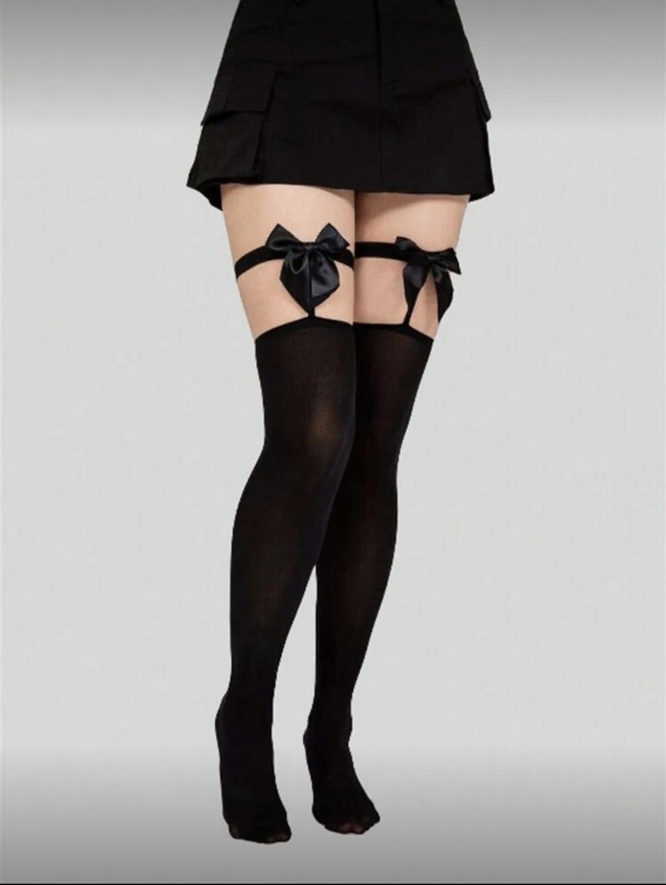 Par de medias negras arriba de la rodilla con lazo negro.
