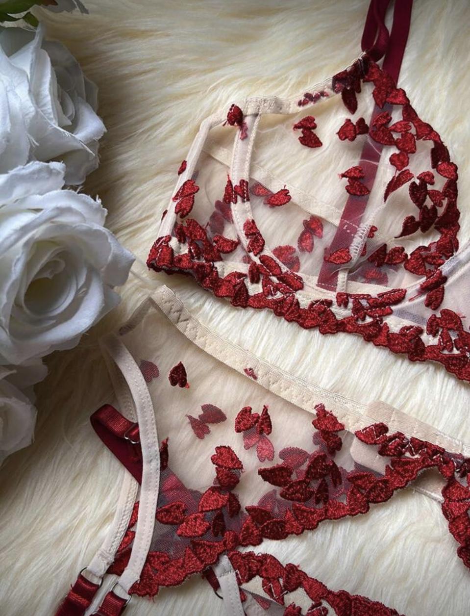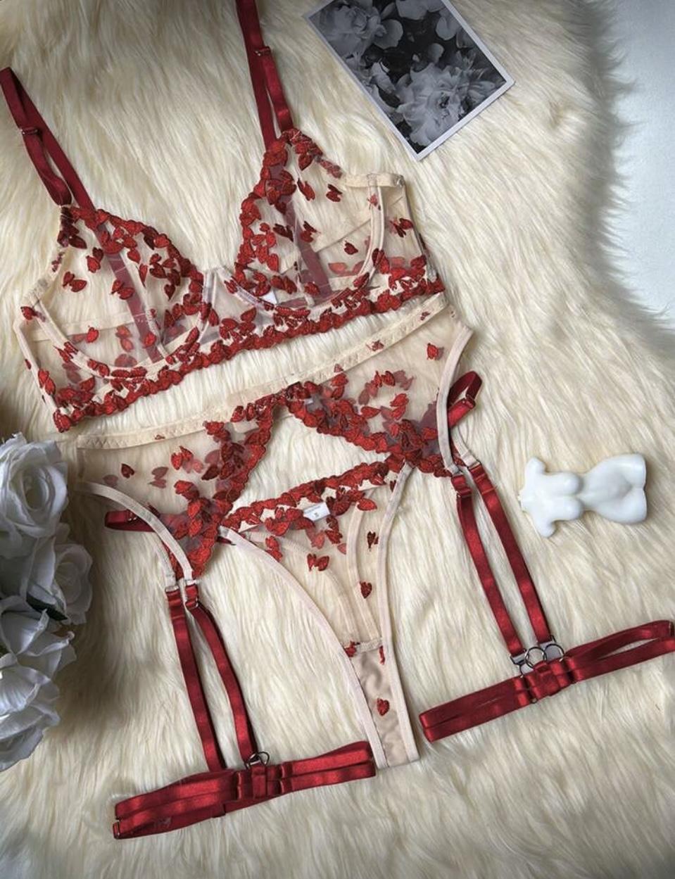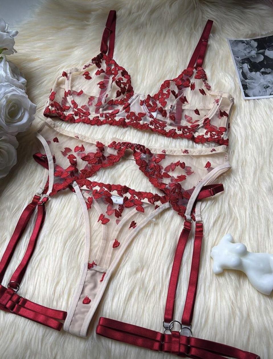 Padrísimo set de 5 piezas, color claro con detalles en rojo con corazones bordados, el sujetador trae varilla, la tanga es ajustable, la cinturilla y un par de ligas dobles.